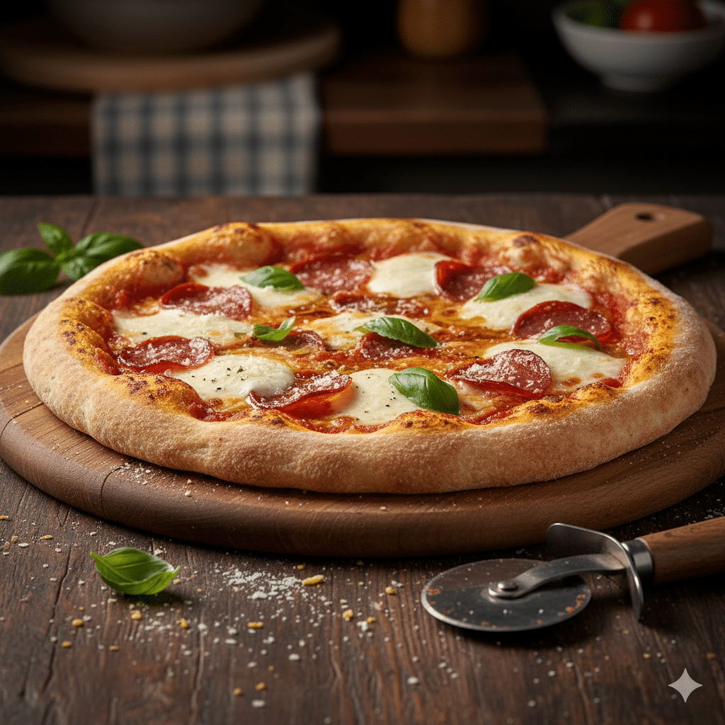 Pizza con base di farina di riso e mais, una gustosa alternativa senza glutine. L’impasto risulta croccante fuori e morbido dentro.