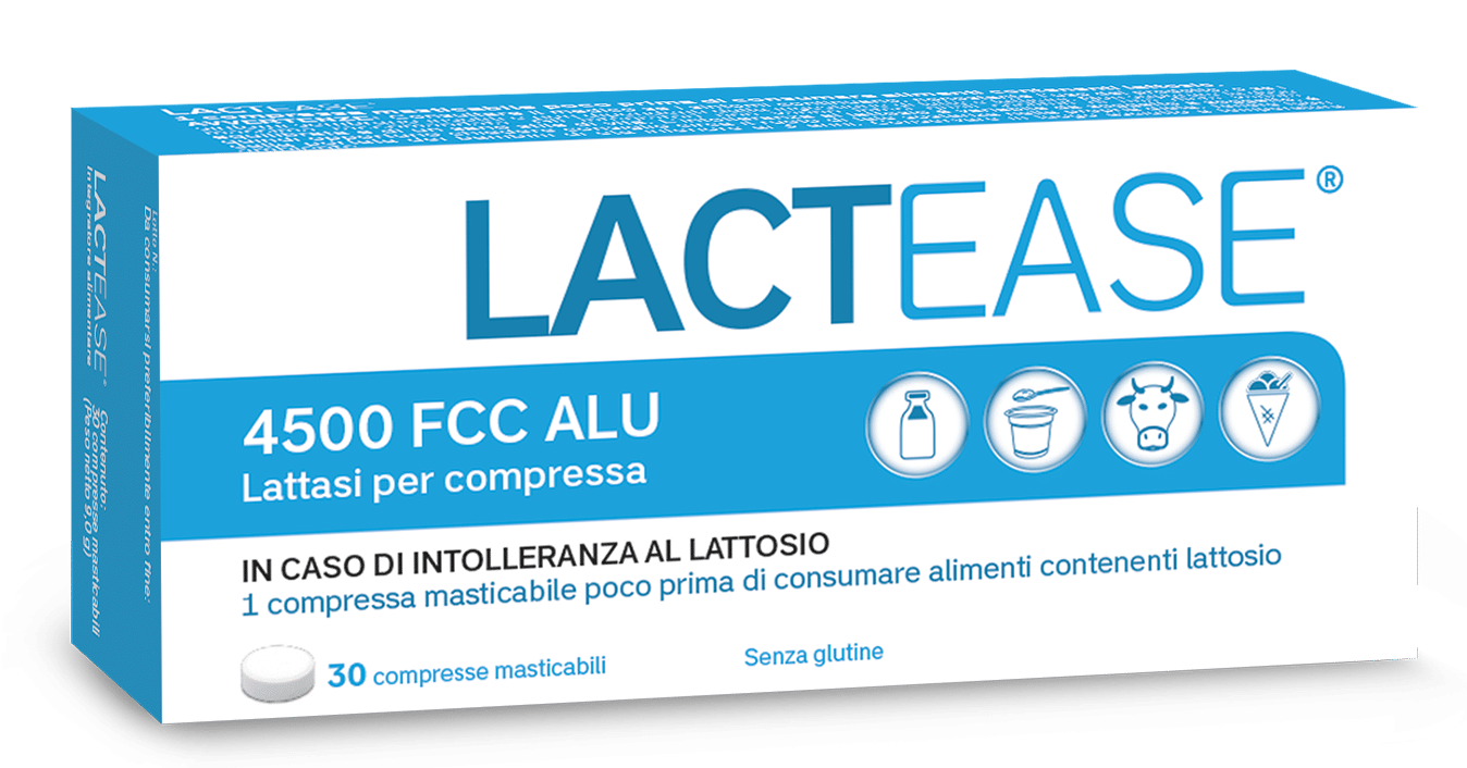 Lactease® integra l’enzima lattasi mancante nel tratto digestivo. La compressa masticabile, assunta poco prima di consumare un pasto con alimenti contenenti lattosio, si scioglierà nello stomaco rilasciando l’enzima lattasi rendendolo cosi disponibile per l’organismo al fine di favorire la conversione del lattosio presente nel chimo in nutrienti digeribili.